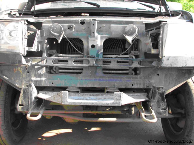 1. Снял решётку радиатора старого образца, стандартный бампер с «Патриота», кронштейны крепления бампера на болтах выдвинул максимально вперёд.